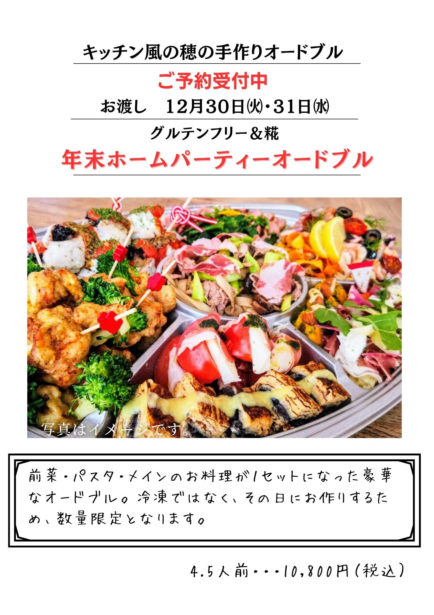 | 年末年始の営業予定 | 12月は2日、9日、16日、23日の火曜日は定休日のためお休み。 30日、31日はオードブルのお渡しのお買い物のみ。(12:00〜18:00) 年明けは1月4日から営業いたします。 |