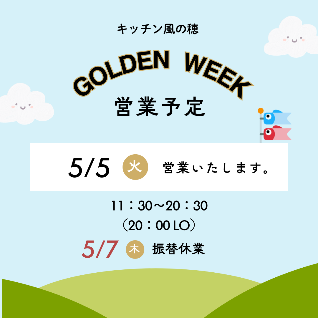 GW期間中は休まず営業いたします。※営業時間の変更あり。