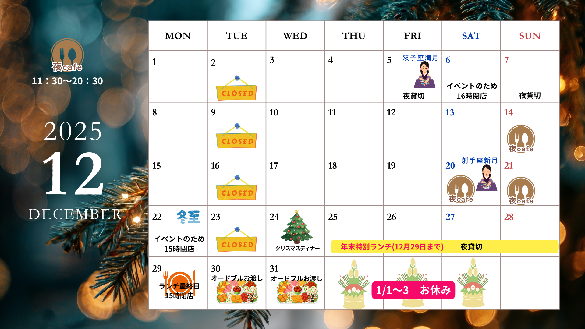 🔶5日㈮/ 双子座満月の自分覚醒リーディングcafe 15:00〜 🔶20日㈯/ いて座新月の自分覚醒リーディングcafe 15:00〜17:00 🔶21日㈰/ 天赦日×甲子の日×一粒万倍日 🔶22日㈪/ 冬至のキャンドルヨガ&瞑想会 🔶24日㈬/ 糀とお野菜のクリスマスディナーパーティー 🔶29日㈪/ ランチ営業最終日 🔶30日.31日/ 年末特別オードブルお渡し |